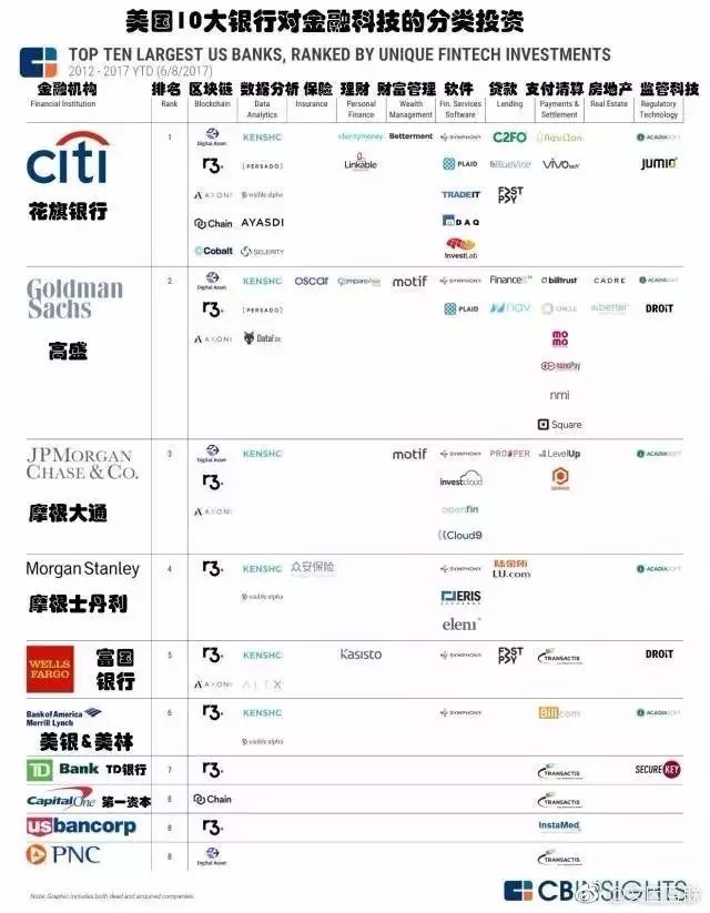 中国四大行被BATJ瓜分,美国前10大银行对Fintech的投资有哪些?