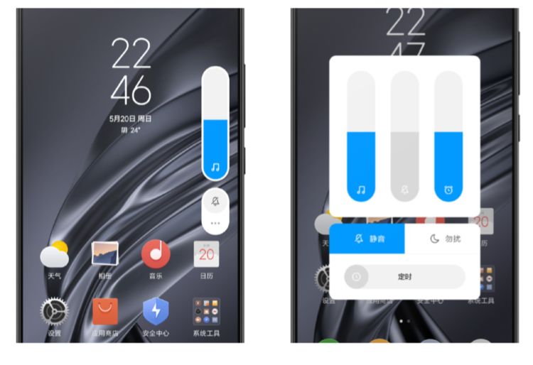 其次,亮度和音量调节面板重新设计。MIUI 10 抛弃了过去小圆点拖拽的亮度调整,将操作按钮放大。音量调整按键,也在竖屏状态下更加方便,增大了触控区域,并且也和物理操作按键进行统一。