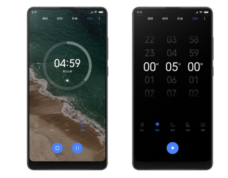声音体验的改变也贯穿在 MIUI 10 的其它功能。比如倒计时工具会提供五种包括森林、海滩等白噪音帮助工作。起床铃声也会根据不同天气播放,并伴随自然的人声播报当天天气、空气质量等信息。