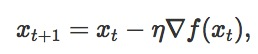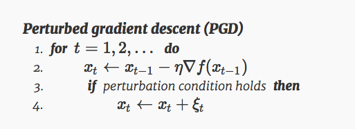 这里 xt 是需优化变量在第t步的值,η 是步长。梯度下降法的理论研究在凸优化上已经很充分了,但是在非凸优化情况下就少了很多。我们知道,在非凸情况下,GD会快速收敛到驻点(附近的点),但是这些稳定的点可能是局部极小点或者是没用的局部最大点或者甚至是鞍点。