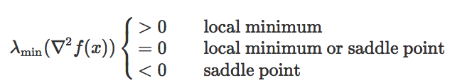 在这篇文章中,我们定义鞍点,既包括经典鞍点,也包括局部极大值。它们是沿着至少一个方向在局部最大化的驻点。鞍点和局部极小值可以根据Hessian的最小特征值来分类: