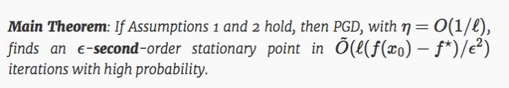 主要定理中,O~(⋅) 只隐藏了对数因子;这边对维度的依赖只有log4(d).。定理证明,在一个额外增加的Hessian-Lipschitz条件下,增加扰动的GD收敛到二阶驻点的时间和GD收敛到一阶驻点的时间几乎是一样的。因此,我们可以得出结论,PGD可以无消耗的逃离鞍点。
