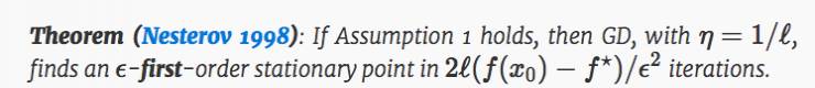 在这个定理中,x0是初始点,f⋆ 是全局极小值的函数。定理规定任何gradient-Lipschitz函数,任何驻点都可以通过GD在第O(1/ϵ2) 次获得,不受d 的影响,这就是所谓的“自由尺寸优化”。对一个GD的成本计算为 O(d),因此整体的运行时间为 O(d)的阶。 O(d)这样线性scaling对现代高维非凸问题(比如深度学习)来说是非常重要的。