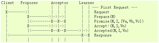 Paxos协议流程划分为两个阶段,第一阶段是Proposer学习提案最新状态的准备阶段;第二阶段是根据学习到的状态组成正确提案提交的阶段,完整的协议过程如下: