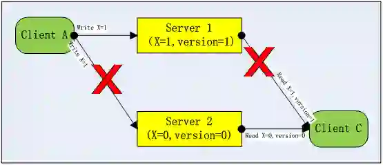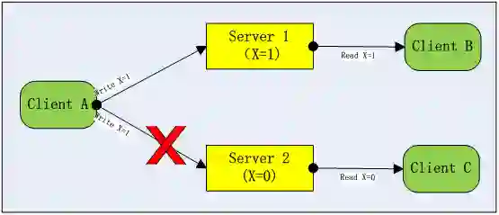如下图1中所示,Client A负责更新数据,为了保证Server 1和Server 2上的数据是一致的,Client A会将X=1的写操作同时发给Server 1和Server 2,但是当Client A和Server 2之间发生网络分区(网络无法连接)时,此时如果让write X=1的写操作在Server 1上成功,那Client B和Client C将从Server 1和Server 2上读取到不一致的X值;此时如果要保持X值的一致性,那么write X=1的写操作在Server 1和Server 2上都必须失败,这就是著名的CAP理论:在容忍网络分区的前提下,要么牺牲数据的一致性,要么牺牲写操作的可用性。