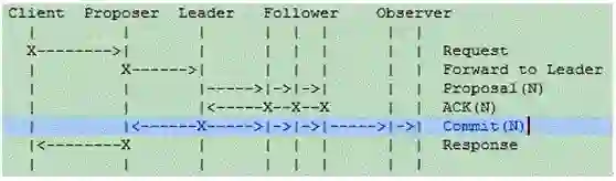 ZAB协议的过程用时序图描述如图4所示,相比Paxos协议省略了Prepare阶段,因为Leader本身就有提案的最新状态,不需要有提案内容学习的过程,图中的Follower对应Paxos协议中的Acceptor,Observer对应Paxos中的Learner。