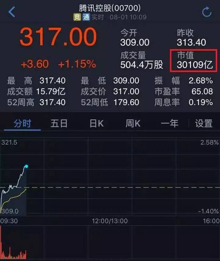 2017年8月1日,腾讯控股总股本94.98亿股,股价达到315.86元,就突破3万亿元。