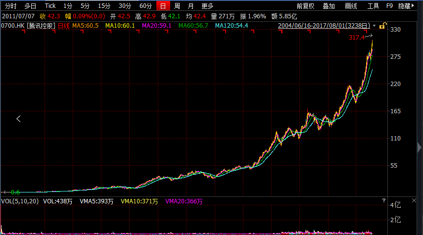 在过去10年里,你几乎任何时候打开这个图,腾讯的股价都是这种三十度向上的趋势。