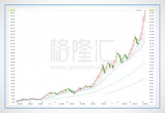 2004年6月16日上市,前复权,2004年7月26日股价最低至0.6元,如今最新收盘价为313.4元,股价涨幅高达521.33倍。