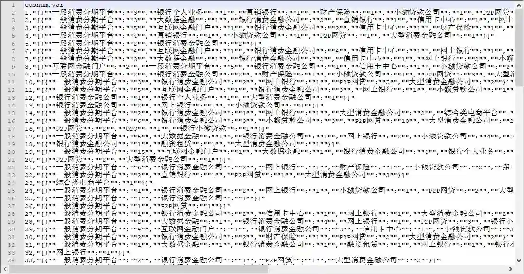 这是一个类json格式嵌套的数据,其中存在两个变量,第一个变量是cusnum作为序号,第二个是一个类json的嵌套变量,里面以类jsno格式嵌套了很多变量。