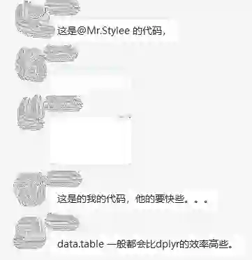 关于如何学习data.table包,大家可以查看本公众号前几期的文章。R语言的data.table包是一个被大多数人远远低估的存在,在这里想强烈推荐给大家!!如果大家对于上面的代码有兴趣的话,也欢迎后台提问~