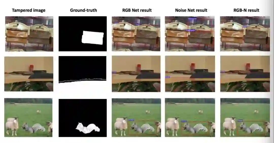 先前的图像处理数据集只有几百张图像,不足以训练一个深度网络。为了克服这个困难,我们在 COCO 数据集的基础上创造了一个合成的篡改图像数据集,用来预训练模型,然后再在不同数据集上对模型进行微调,以进行测试。我们在四个标准数据集上的试验结果表明,该模型的表现十分优秀。我们的这项研究有两大贡献。一,我们展示了如何将 Faster R-CNN 框架改造为可以执行图像处理检测的双流框架。我们研究了两种模式——RMB 篡改痕迹和局部噪声特征不一致性,对这两种模式进行双线性池化,以识别被篡改的区域。二,我们证明了在检测不同篡改方法时 RGB 流和噪声流时互补的,这使得我们的框架在四个图像处理数据集上的表现优于其他先进的方法。