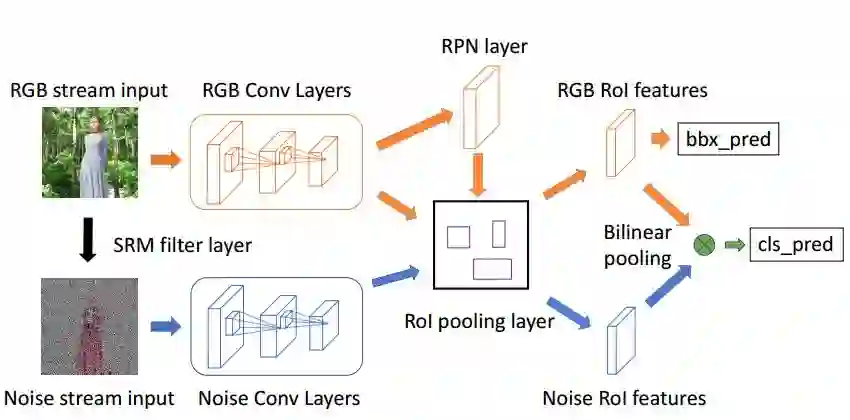 在本文中,我们提出了一种双流Faster R-CNN网络,对其进行端对端训练,检测经处理图像中被篡改的区域。其中一个流是RGB流,其作用是从RGB图像输入中提取特征,找出篡改痕迹(例如:对比度差异、不自然的边界等)。另一个流是噪声流,其作用是利用从SRM模型(steganalysis rich model)过滤层中提取的噪声特征,找出图像中真实区域和被篡改区域的噪声间的不一致。然后,用一个双线性池化层整合从RGB流和噪声流中提取出的特征,以进一步改进这两种模式的空间共现性(spatial co-occurrence)。