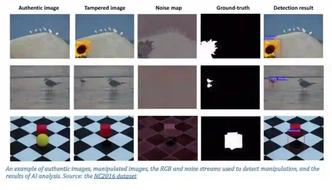 为了识别出这些处理操作,数字取证专家通常会在图像的隐藏图层中寻找线索。上面提到的三种操作往往会留下数字处理痕迹,例如:由图像传感器造成的颜色和亮度随机变化不一致现象(也称图像噪声)。举例来说,当拼接两张不同图像,或者在同一图像中将某一部分中的一个物体复制粘帖到另一部分时,背景噪声会无法匹配,就像是用另一种与墙面颜色相近的颜料涂抹墙上的一个斑点。