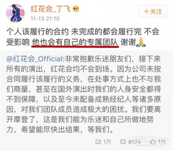 “非常抱歉乐迷朋友们,接下来所有的演出,红花会均不会到场。因为公司未按合同履行该履行的义务,在处事方式上也不与我们商量,甚至在国外演出时我们的人身安全都得不到保障,以及至今未配备成熟经纪人等诸多原因,对我们团队成员造成极大的困扰。我们要离开摩登了,这是我们能为乐迷和自己所做地努力,希望能尽快出结果,等我们。”