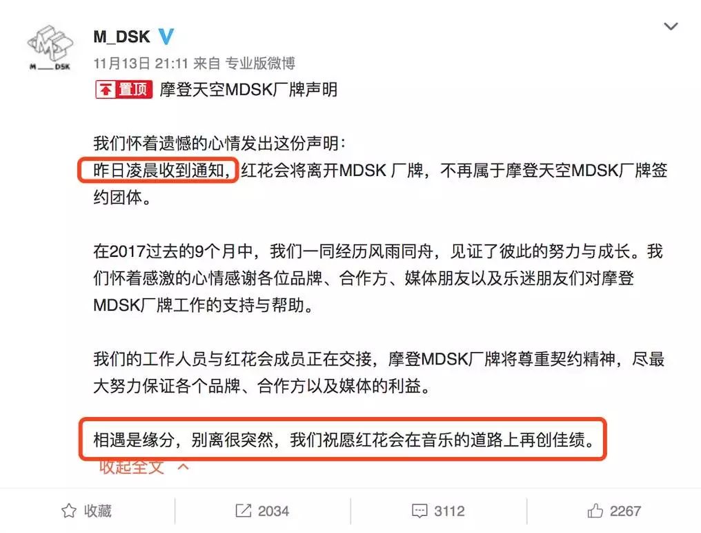 过了不到一个小时,摩登天空MDSK官方微博“M_DSK”(摩登天空HipHop厂牌)作出了回应:“昨日凌晨收到通知,红花会将离开MDSK 厂牌,不再属于摩登天空MDSK厂牌签约团体。”