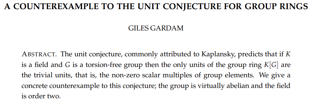 近日,一位名为 Giles Gardam 的博士后数学家就单位猜想(unit conjecture)的问题进行了一场在线讲座。他仔细地阐述了该猜想的发展历程,并解释了其与强大代数机制「K 理论」之间的联系。然后,在演讲的最后几分钟,他推翻了令人困惑 80 多年的单位猜想。