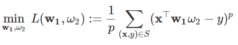 这里 S 代表一个训练集,它由一对(x,y)组成,其中 x 是一个表征事件的向量,y 是一个表征其标签的(数值)标量;w 是我们想要学习的参数向量。现在,让我们用向量 w_1 乘上标量 ω_2 替换向量 w,把线性模型转换成一个非常简单的深度为 2 的网络。显然,这种过参数化操作并没有改变网络的表现力,但却生成了非凸目标函数(non-convex):