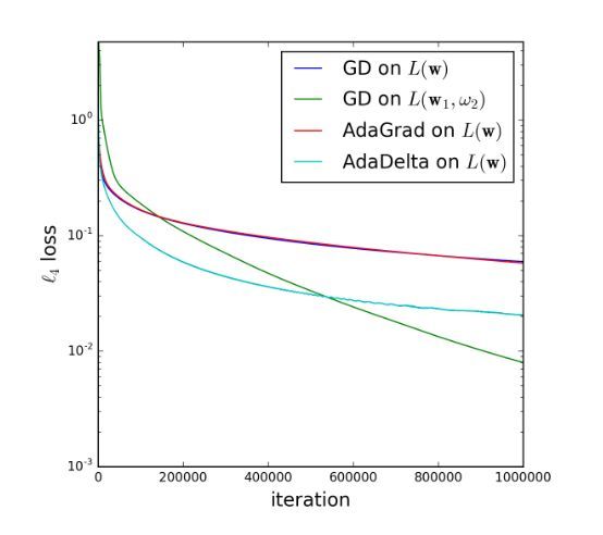 这里我们注意到,过度参数化不仅仅加速了梯度下降,而且其加速效果还优于两个著名的梯度下降方案——AdaGrad 和 AdaDelta,在本实验中,前者并没有真正起到加速作用。在其它设置中,我们也观察到了类似的加速。