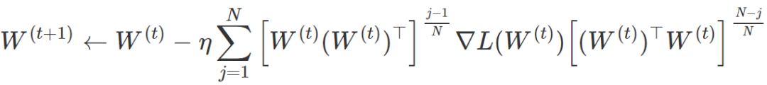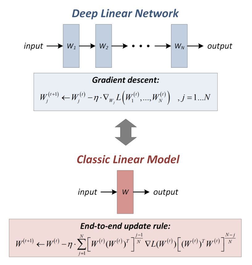 假设我们有兴趣来学习一个线性模型,其参数化由矩阵 W 完成,通过一些训练损失函数 L(W) 极小化来得到。我们不直接用使用矩阵 W,而是将其替代为一个深度为 N 的线性神经网络,例如我们将其过参数化成 W=W_NW_N−1⋯W_1,其中 W_j 是特定层的权重矩阵。在文中,我们指出如果人们在 W_1…W_N 上以低学习率η应用梯度下降,且有: