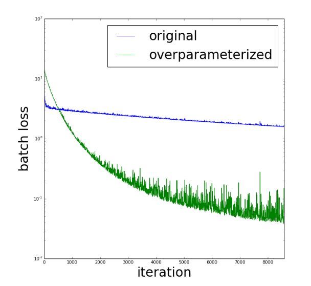 作为最后一项实验,我们评估了在一个简单深度学习设置(基于 MNIST 数据集的 TensorFlow 卷积网络教程)上过参数化对优化的效果。通过简单地连续放置两个矩阵,而不是每一密集层的矩阵,我们引入了过度参数化。通过添加大约 15% 的参数数量,优化的提升呈数量级增长。