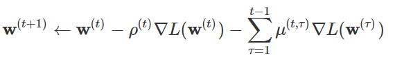 其中ρ^(t) 和μ^(t,τ) 可被恰当地定义为(依赖时间的)系数。因此,看似一个正常的乘法标量的加法将普通的梯度下降转换成了一个以某种方式记录了过往的梯度(momentum 方法的关键特征)以及随时间变化学习速率有所差异的组合形式。尽管对 momentum 方法之精确好处的理论分析绝不容易,但是一项基于 UCI 机器学习库的「Gas Sensor Array Drift at Different Concentrations」数据集的简单实验(p=4)为我们展示了如下的效果: