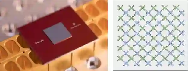 谷歌最新的量子处理器 Bristlecone(左)。设备示意图(右):每个「X」代表一个带有最近邻连接的量子比特。