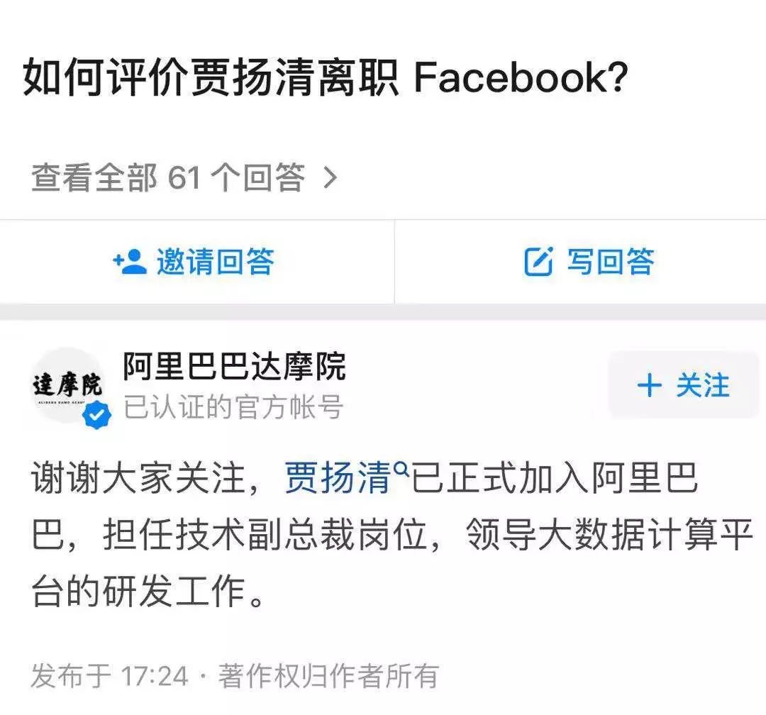 3月18日傍晚,阿里巴巴达摩院通过知乎账号宣布,原Facebook人工智能科学家贾扬清已正式加入阿里巴巴,担任技术副总裁岗位,领导大数据计算平台的研发工作。阿里巴巴达摩院在知乎问题“如何评价贾扬清离职Facebook?”下宣布了这一消息。