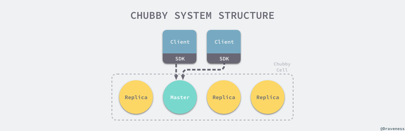 在一个 Chubby Cell 中,只有 主节点会对外提供读写服务,其他的节点其实都是当前节点的副本(Replica),它们只是维护一个数据的拷贝并会在主节点更新时对它们持有的数据库进行更新;客户端通过向副本发送请求获取主节点的位置,一旦它获取到了主节点的位置,就会向所有的读写请求发送给主节点,直到其不再响应为止。写请求都会通过一致性协议传播到所有的副本中,当集群中的多数节点都同步了请求时就会认为当前的写入已经被确认。