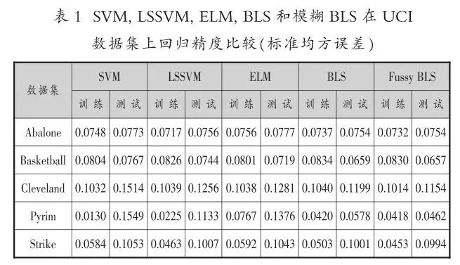 陈俊龙团队在对数据维度为1万-3万的20万数据测试中发现,在3-50分钟之内,宽度学习都能够很快地找到神经网络的权重。在UCI数据上回归精度比较分析发现,宽度学习系统和模糊宽度学习系统都表现出较高的精度,具体比较结果参见表1。[21]