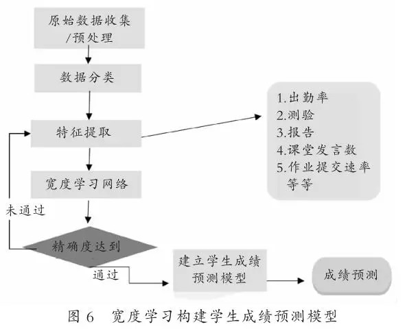 而与深度学习网络算法相比,宽度学习的优势在文中已经阐述。根据宽度学习作用于大数据的主要技术分类和时序预测,该模型在数据分类和多个时间序列数据上的测试结果表明,基于宽度学习所建模型具有更高的有效性和精度。通过宽度学习神经网络方法构建学生成绩预测模型的具体步骤,如图6所示。