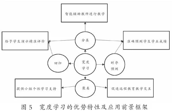 具体来说,我们期待宽度学习可在准确预测学生学业成绩、给予学生演示精准评价、提供小组个性学习支持、智能辅助教师进行教学和促进远程教育教学交互等方面,发挥其既快又准的优势,为促进教育信息化和智能化发展服务。我们根据宽度学习四个方面的优势特性,以及发挥维度所确定的宽度学习应用前景,建立了如下框架(如图5所示)。