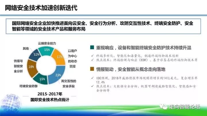 网络安全技术加速创新迭代。国际网络安全企业加快推进面向云安全、安全行为分析、攻防交互性技术、终端安全防护、安全智能等领域的安全技术产品和服务布局。其中,云端安全能力发展前景可期,用户逐渐成为安全行为分析的新中心,虚拟化助推交互性攻防技术发展,设备和智能终端安全防护技术持续升温,安全智能从概念走向落地。