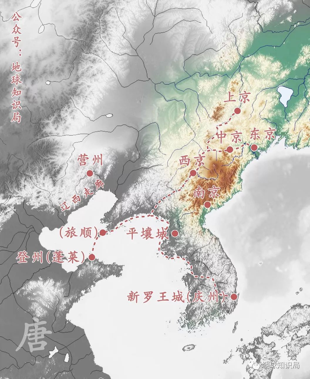 以唐朝的登州港为始点,经过庙岛群岛,到达现在的旅顺,随后沿着辽东半岛东海岸东行,直至鸭绿江口。在此可分两路,一条路称作“鸭绿朝贡道”,只需溯江而上,沿着鸭绿江航道北行直抵渤海国中心;另一条路被称作“高丽道”,沿朝鲜半岛的西海岸航行,直至现在的仁川海域,随后朝东南前行,到达新罗王城。