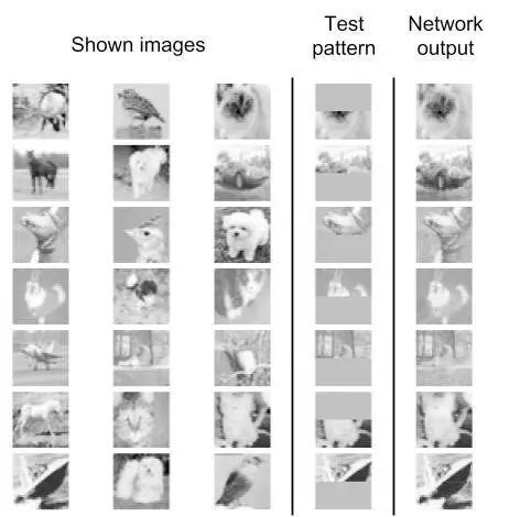 图1:图像填充完整的过程( 每行表示一次独立的实验 )。在给定三张图像之后,在网络中输入一部分图像,然后必须从内存中重构出丢失的部分。非塑性网络( 包括 LSTM )无法解决此类任务。源图像来自 CIFAR10 数据集。