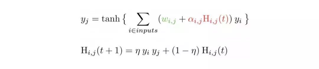 第一个公式是神经网络单元中典型的激活函数,除了输入权重具有一个固定的分量( 绿色 )和塑性分量( 红色 )之外。塑性部件中的 H_ij 项通过输入和输出函数进行自动更新( 如第二个公式中所述,注意如论文中所讨论的,其他更新方法也是可以的 )。