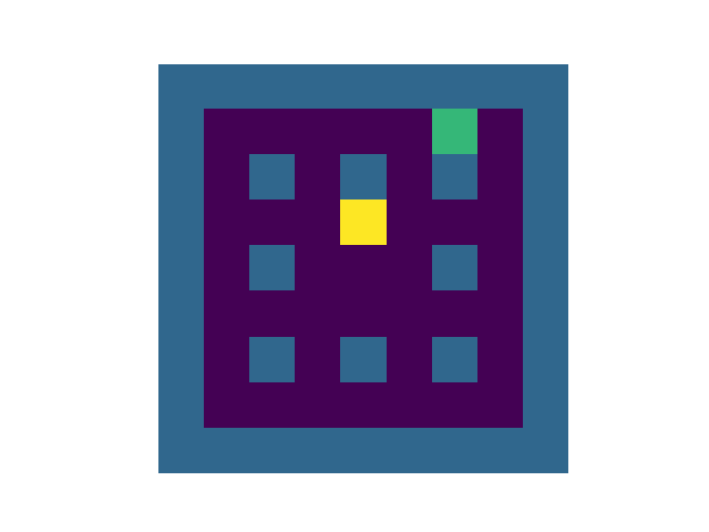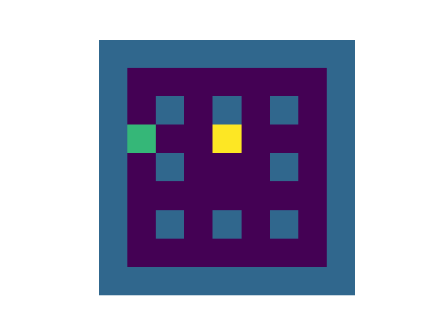 图2:迷宫探索任务。智能体( 黄色方块 )需要尽可能多的找到奖励位置( 绿色方块 )来获得相应的奖励( 智能体在每次发现奖励后将被随机传送到其它地点 )。在第 1 个循环中(左),智能体的行为本质上是随机的。经过 300,000次迭代后(右),智能体已经记住了奖励地点并直接导向它。