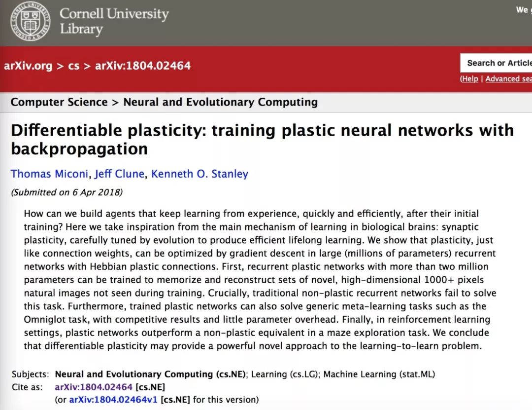 相比之下,生物大脑表现出了一种可塑性——也就是说,在生物整个生命过程中,神经元之间的连接能力是在不断的自动变化,使动物能够在日新月异的生活中快速且高效地学习。而大脑中不同区域和连接的可塑性水平,则是数百万年来进化的结果,它能够让生物在一生中进行有效的学习。由此产生的持续学习能力可以让动物在只需很少的附加数据下,适应变化莫测或不可预测的环境。这就是为什么我们可以快速记住我们以前从未见过的模式,或者在完全陌生的情况下只需几次试验,就能学习到新的模式。
