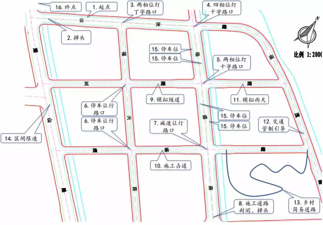 考点设置:1.起点 2.施工引导折返 3.临检路障 4.故障车辆 5.终点