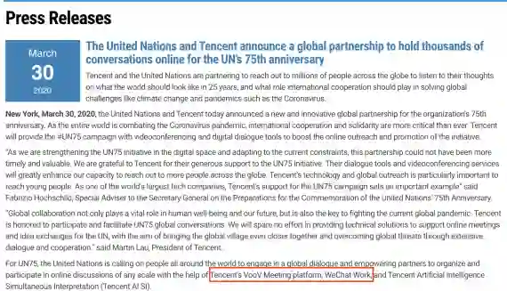 美东时间3月30日,联合国在纽约总部宣布腾讯公司成为全球合作伙伴,为联合国成立75周年提供全面技术方案,其中腾讯会议、企业微信将为这场有史以来最大规模的全球对话提供远程会议服务,在线举办数千场会议活动。