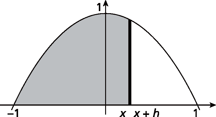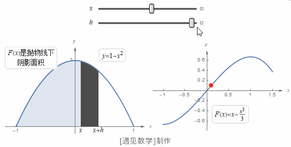 让我们回到求面积的问题上。微积分的基本定理把面积和原函数的概念联系了起来。如果设 是横坐标为 x 的竖线左侧的抛物线部分的面积,由于函数
