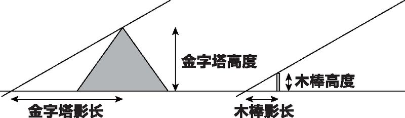 例如,我们常把“第一个”几何推理归功于泰勒斯。金字塔太高,高度无法直接测量。为了测量它的高度,泰勒斯想到了一个办法:他测量了金字塔在地上的投影长度,再单独测量了一根小木棒的高度和影长,然后应用比例法则。