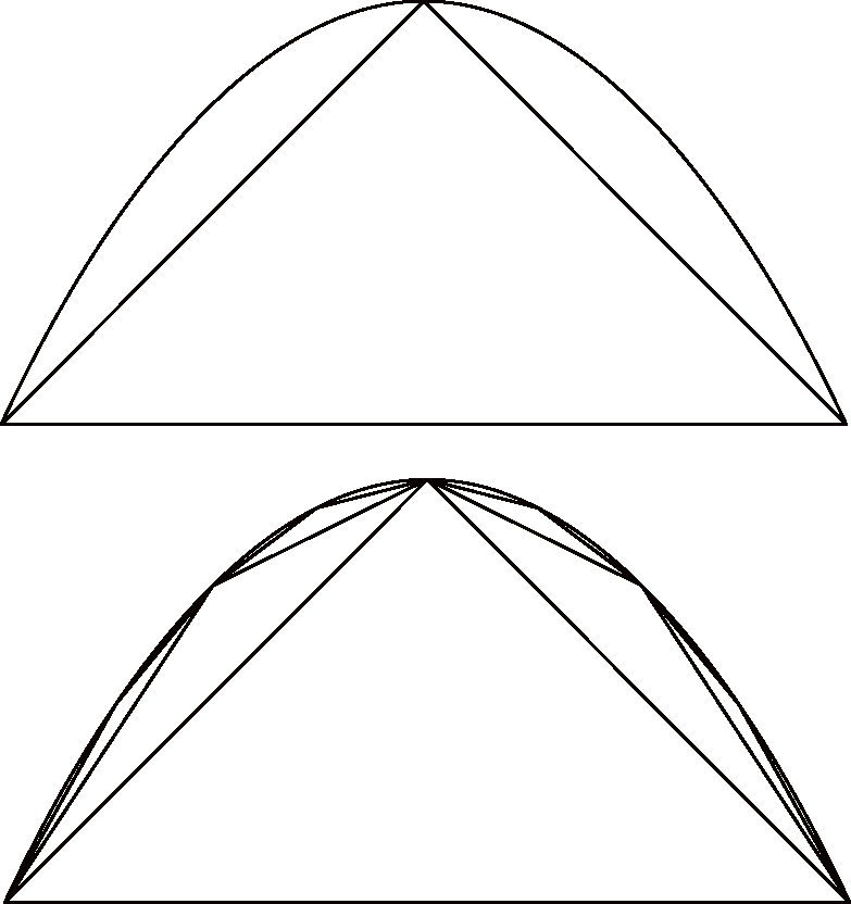 ……也就是抛物线内接多边形的面积,它总是比抛物线弓形本身的面积小。他证明了抛物线弓形的面积不可能小于