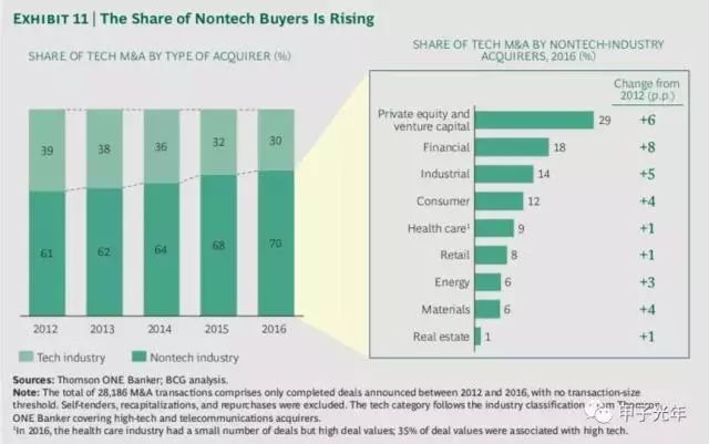 一个显著特点是:促进技术并购案增长的收购主力军是“非技术行业的买家”,比例从2012年的61%上升到2016年的70%。