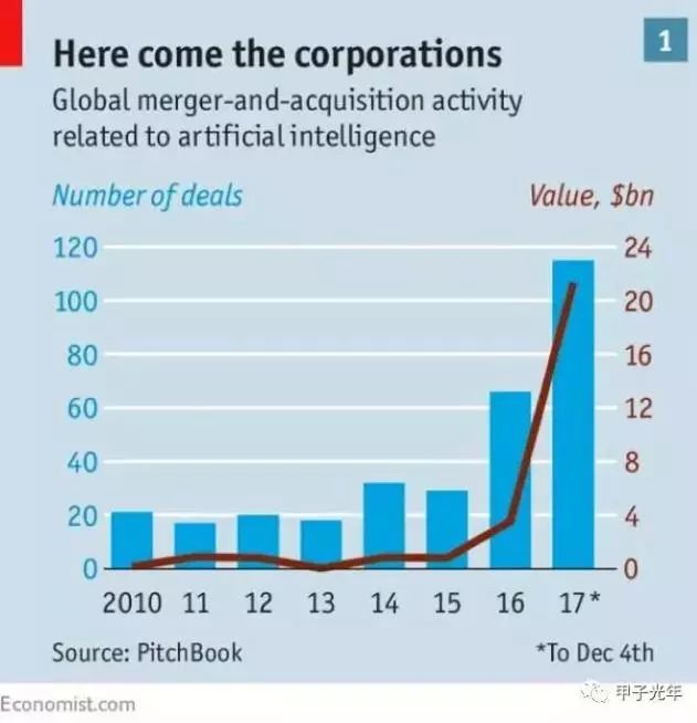 市场趋势也反映了这一点。以AI为例,据《经济学人》总结,截至2017年12月,全球AI领域的合并与收购金额高达213亿美元——交易数量比2015年多出26比。