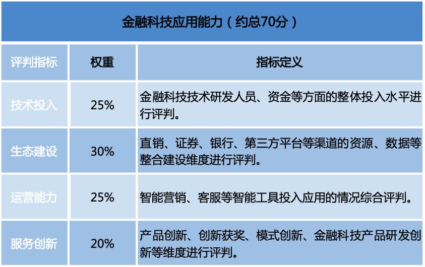 Analysys易观认为,金融科技资源能力是金融科技应用综合能力基础体现,在金融科技创新应用方面,金融科技应用能力才是付诸实践的关键。易观将技术投入、生态建设、运营能力、服务创新作为评判基金公司金融科技应用能力的关键指标。