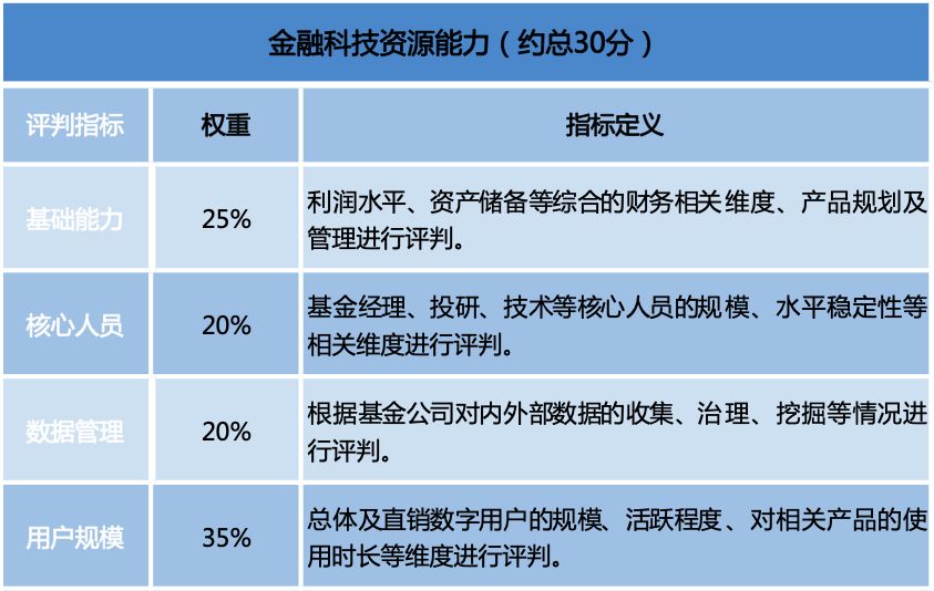 Analysys易观认为,随着中国基金市场数字化程度的加深,各家基金公司及第三方平台对金融科技的重视程度加大,多家基金公司将金融科技作为重要的战略部署方向,纳入企业核心竞争力构建体系之中。券商系、银行系、信托系等不同背景的基金公司在金融科技资源能力方面存在重要差异。易观把基础能力、核心人员、数据管理、用户规模作为评价基金公司当前金融科技资源能力的重要指标。