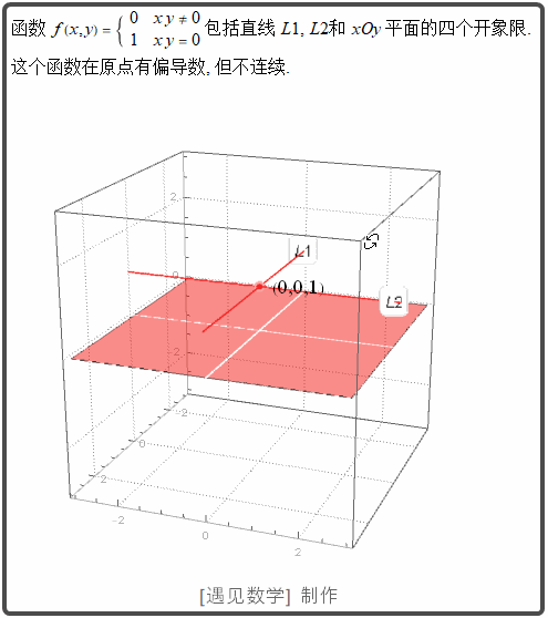 一元函数导数即意味着连续, 但二元函数 f(x,y) 不同, 在一个点不连续, 但对 x 和 y 可以求偏导.