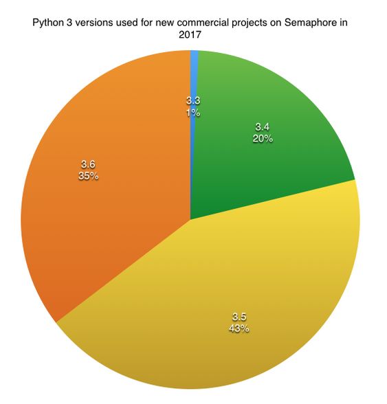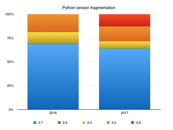 3.5 版和 3.4 版的使用率分别只占 43% 和 20%,有 35% 的用户已经开始使用 Python 3.6