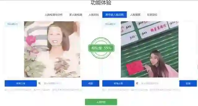 第三步:打开AI.QQ.COM,在跨年龄人脸检测页面中分别上传两张照片,并点击人脸识别,得到识别结果。
